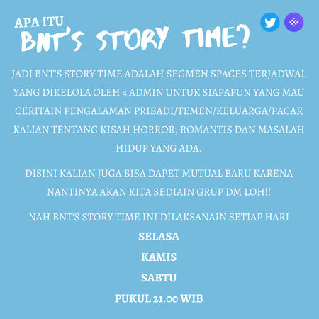 Jangan lupa beri kami kritik, saran, ataupun lainnya agar BNT'S STORY TIME dapat terus berkembang!